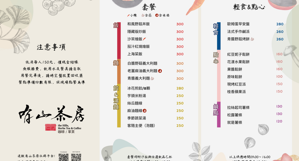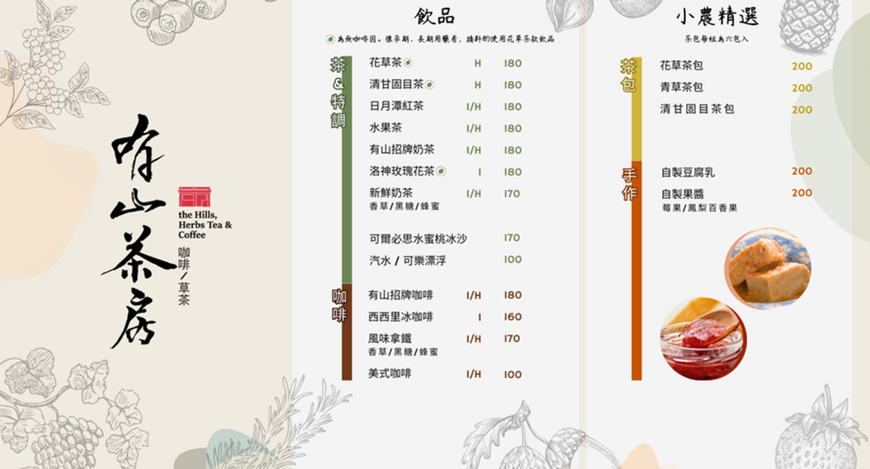 除餐點外,也提供多種手沖咖啡、小農手做果茶、現泡日月潭紅茶等,歡迎來坐坐!